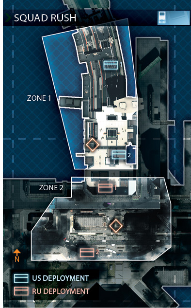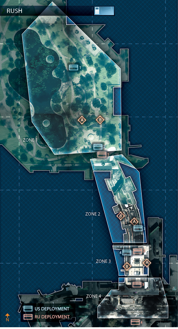 (マップ画像はhttp://www.7tharmored.com/Evo-Forums_-_file_-_viewtopic_-_t_-_422.htmlより引用。ただし画像中の拠点名はAとCが逆) 米海兵隊は地下鉄のトンネルの中に、ロシア軍は地下鉄駅前の大型ビルにスタート地点がある。 戦闘は基本的に駅構内の改札口の拠点Bを巡って行われる。 海兵隊側からだと改札口までホームの拠点Aから銃砲弾の雨の中階段を駆け上がる必要があるが、駆け上がってしまえば近接戦闘に持ち込める。 また海兵隊側から見て奥側のエスカレーターは割と守備が薄いことが多いため、ここを突破してそのまま駅を飛び出し、すぐそばにある駅前のロシア側拠点へ駆け抜けるのも有効だが、階段のクレイモアやC4に注意。 一方ロシア側からだと駅前広場の拠点Cから高低差もなく一直線だが、改札側からも割と見通しがいいため一度拠点を奪取されると攻めづらくなる。 完全に一本道ではないものの、両者とも改札口を攻撃するルートがかなり制限されているため激しい戦いになりやすい。 このマップは特に戦線が膠着しやすい為、Bの階段付近ではグレネード等の爆発物の応酬になっていることも多い。 その為、最初どれだけの人数が拠点Bに駆け込むかが、初期の主導権を決めることが多く、初動が非常に重要である。敵の戦線を大幅に崩す拠点Aと拠点Cへの裏取りは極めて重要で、もし味方が裏取りしていたら積極的にリスポンしてあげよう。また全拠点を抑えられると挽回が非常に困難(特にロシア側)で、味方が拠点にこもり始めるとベースレイプになりやすいため、なんとかAとCは抑えておきたい。