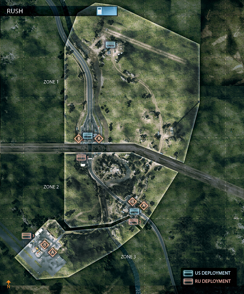 ベースに近い拠点をベース側の軍が占領すると(ロシア側で拠点A、アメリカ側で拠点E)、戦車がスポーンする。