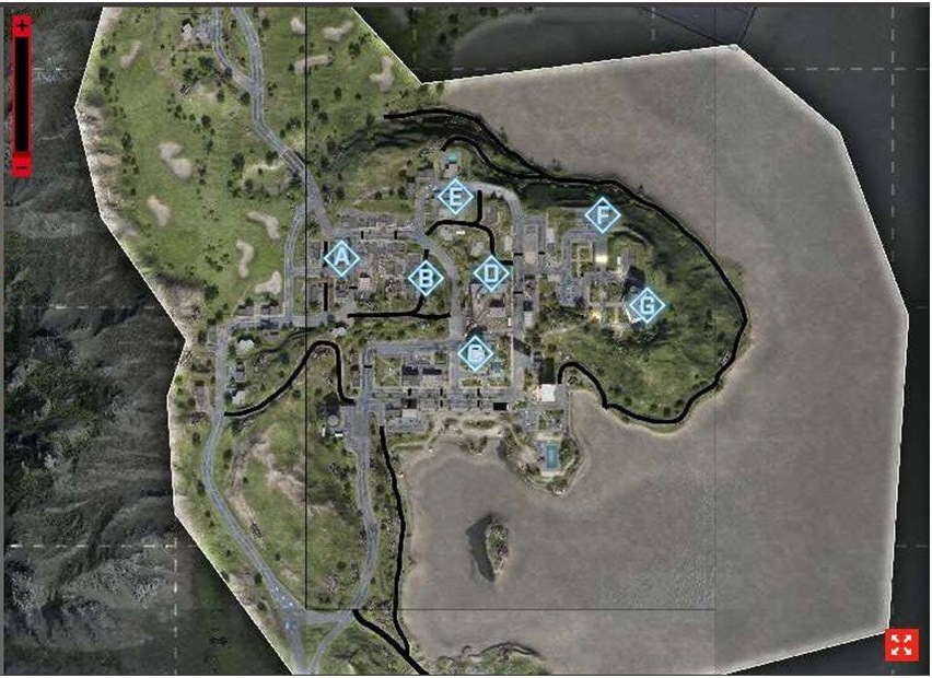(マップ画像はhttp://bad-bros.com/news.phpから引用し加工) 開始時にはUS側が全拠点を制圧しているコンクエストアサルトモード。 BF2からはマップ北側の拠点E、Fが追加されている。 テレビ局の拠点Gの旗は2階のバルコニーに、工事現場の拠点Dの旗は現場の屋上にある。 またマップ全体の高低差も割とあるため、マップ上では近くても意外と到達に時間がかかったりする。