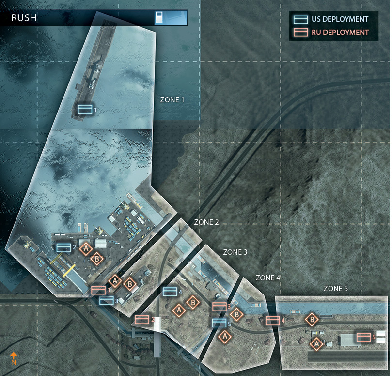 海兵隊側は頑丈な水陸両用リスポンポイントであるアムトラックや、多くの兵員を迅速に輸送できるUH-1を有効活用しよう。 乾ドックの拠点Bは占領するとIFVが湧く。火力で劣勢なのでここは押さえておきたい。 また揚陸艦の対空砲は港まで届くため、敵航空機の排除のほか岸壁付近の掃射にも使える。